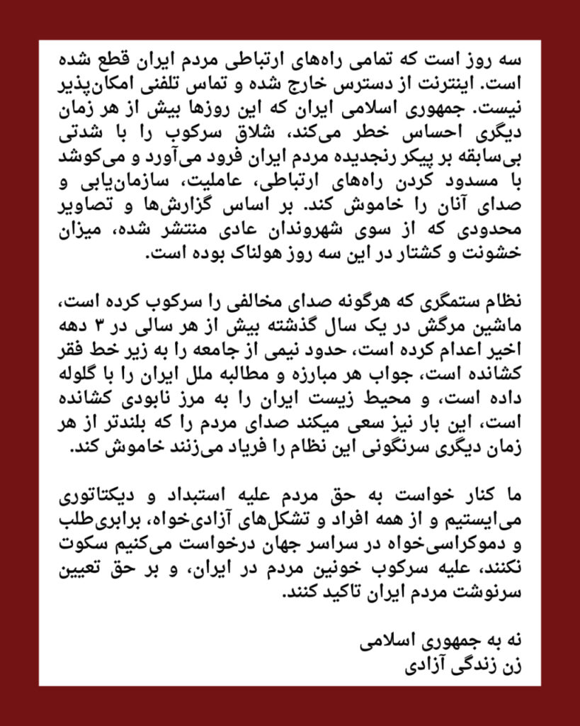 سه روز است که تمامی راههای ارتباطی مردم ایران قطع شده است. اینترنت از دسترس خارج شده و تماس تلفنی امکانپذیر نیست. جمهوری اسلامی ایران که این روزها بیش از هر زمان دیگری احساس خطر میکند، شلاق سرکوب را با شدتی بیسابقه بر پیکر رنجدیده مردم ایران فرود میآورد و میکوشد با مسدود کردن راههای […]